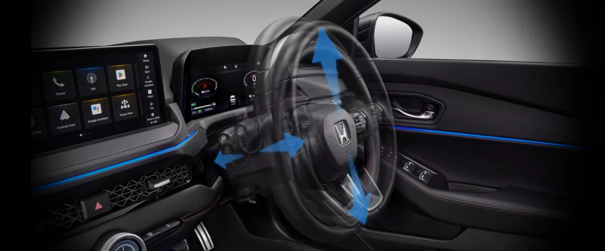 Anda dapat mengatur posisi roda kemudi sesuai dengan postur tubuh Anda, cukup dengan menarik tuas yang terletak di bagian bawah roda kemudi.