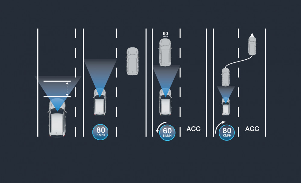 Adaptive Cruise Control (ACC) membantu menjaga kestabilan kecepatan kendaraan dan mengatur jarak di belakang kendaraan yang terdeteksi di depan.