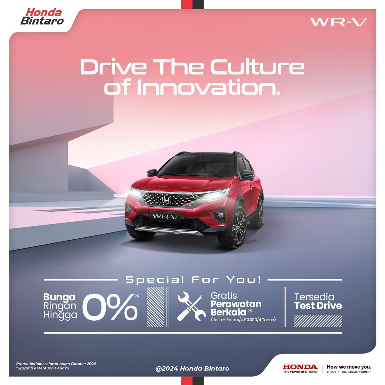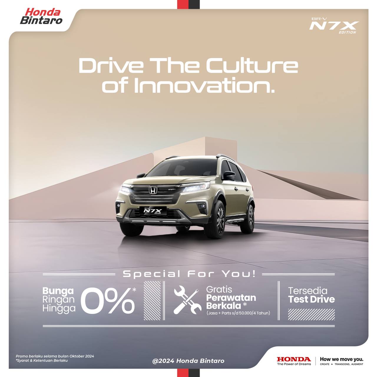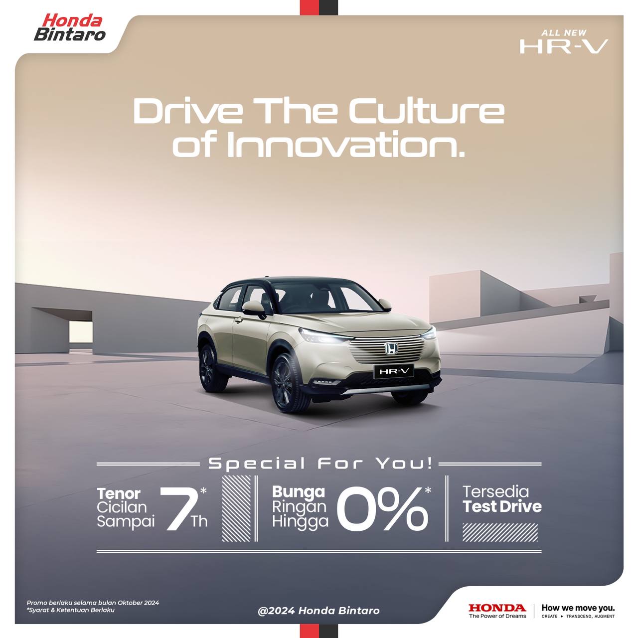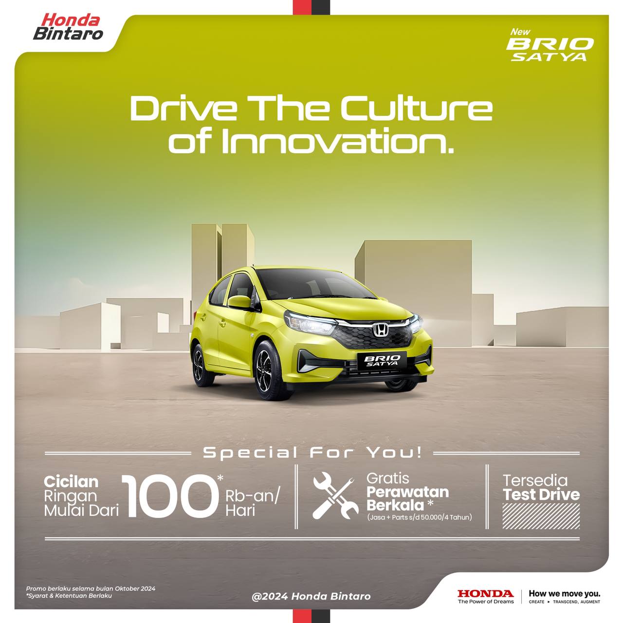 Hai teman Honda! Inilah program penjualan terbaru Honda di bulan Oktober: Drive teh Culture of Innovation with Honda. Hah emang iya cuma dengan cicilan mulai 100 ribuan/hari kamu bisa punya New Honda Brio Satya? Si gesit paling irit yang nyaman dibawa ke mana aja.