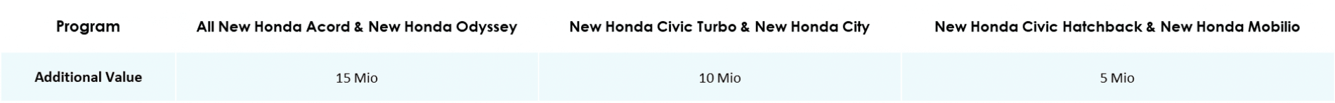 Paket Kredit dengan bunga 0% selama 1 tahun untuk pembiayaan melalui Mizuho Balimor Finance untuk model New Honda HR-V, All New Honda Accord, New Honda Odyssey, New Honda Civic Turbo, New Honda Civic Hatchback RS, dan New Honda City.