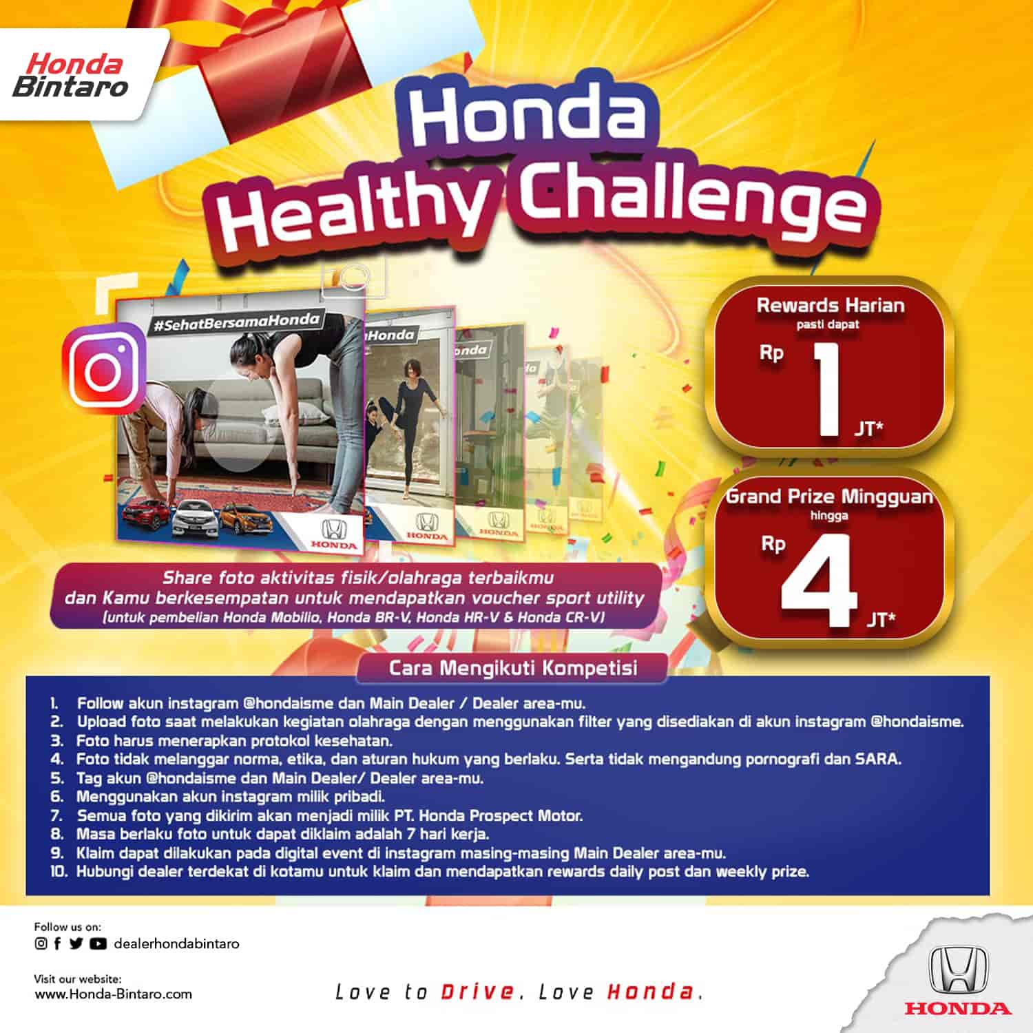 Melalui program “Honda Healthy Challenge”, Honda mengajak konsumen untuk berolahraga di rumah. Konsumen pun akan mendapatkan program-program menarik untuk pembelian Honda di periode Maret 2021.